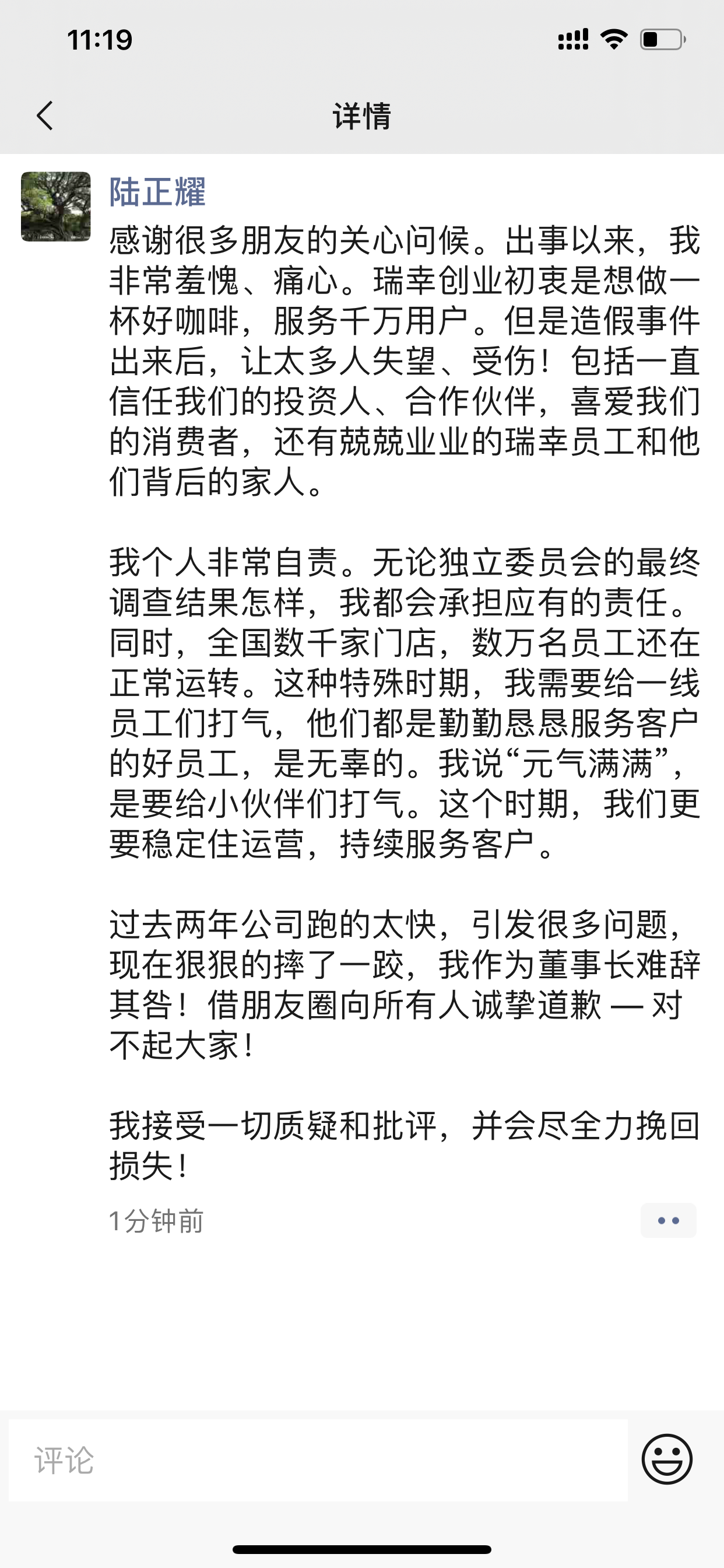 感谢很多朋友的关心问候。出事以来,我非常羞愧、痛心。瑞幸创业初衷是想做一杯好咖啡,服务千万用户。但是造假事件出来后,让太多人失望、受伤!包括一直信任我们的投资人、合作伙伴,喜爱我们的消费者,还有兢兢业业的瑞幸员工和他们背后的家人。