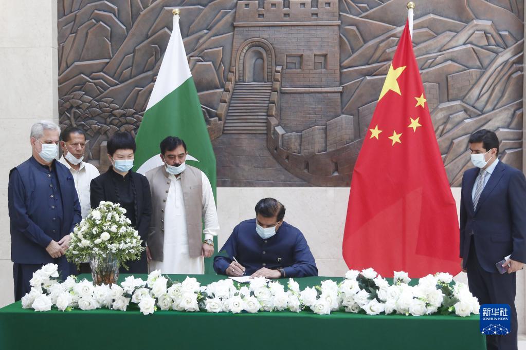 5月1日,巴基斯坦国民议会议长阿什拉夫在伊斯兰堡中国驻巴使馆吊唁簿上留言。新华社发(艾哈迈德·卡迈勒摄)
