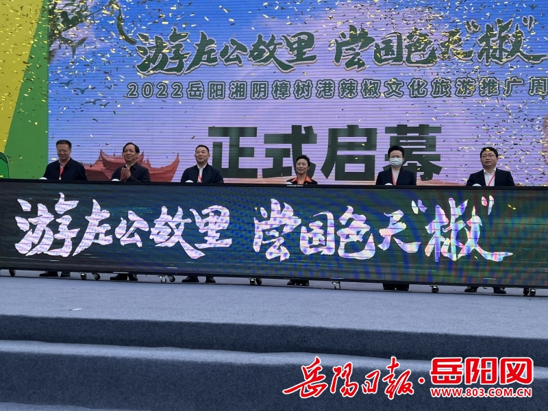岳阳日报全媒体5月11日讯(记者 方璐)游左公故里,尝国色天“椒”。5月11日上午,2022岳阳湘阴樟树港辣椒文化旅游推广周在湘阴“辣椒小镇”樟树镇火辣开启!湖南省商务厅党组副书记谭平宣布开幕,市领导刘启峰、魏淑萍参加。