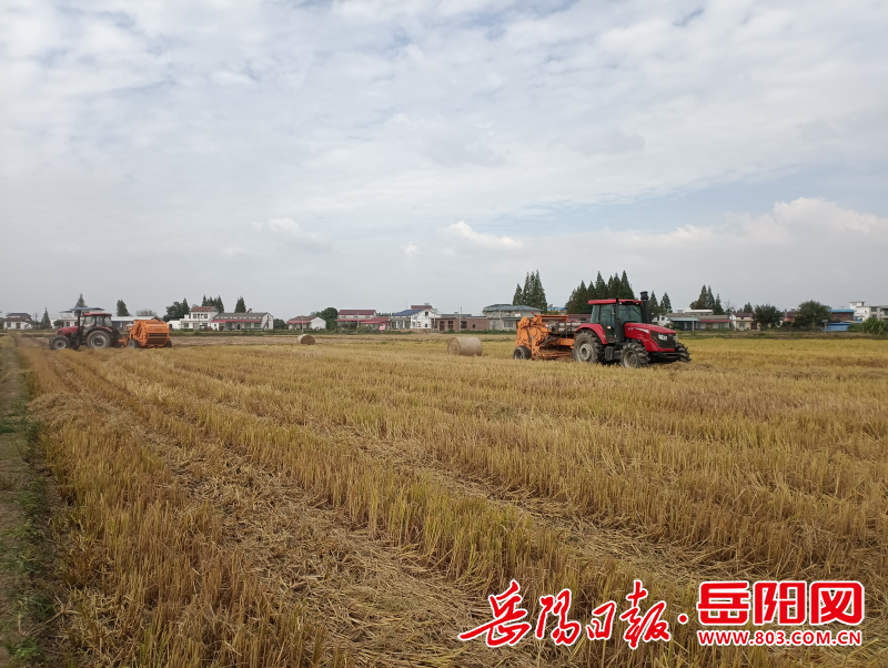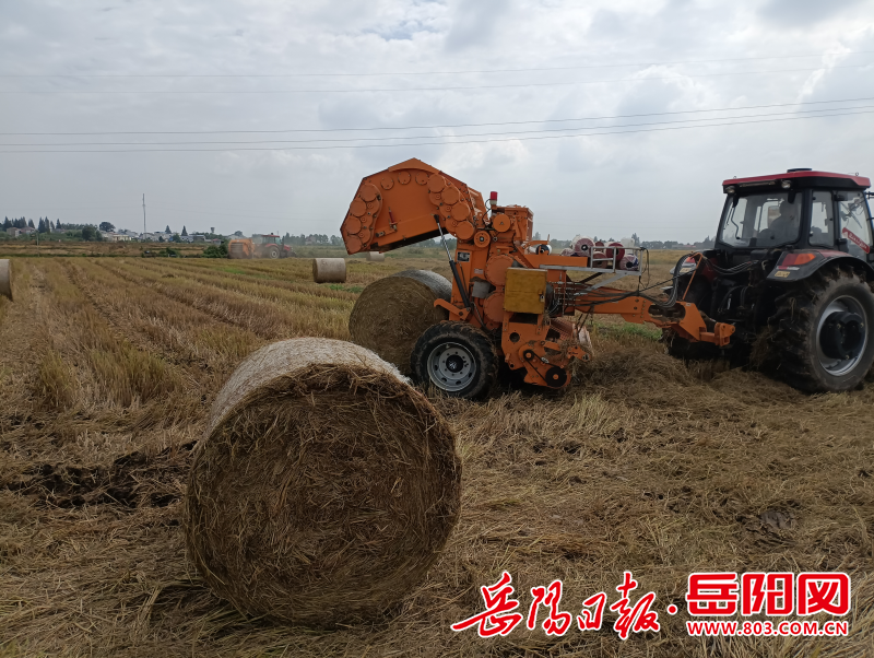 岳阳日报全媒体讯(通讯员 施定龙)金秋十月,在华容县操军镇白莲村,两支专业化农机队,正在收获完的水稻田进行搂草打捆作业,搂草机来回穿梭,成排旋转的轮盘将杂乱无序的稻草快速归拢成线,捆草机马达轰鸣,将稻草打成一个个圆捆大包,即将运输离田,送往收储点。