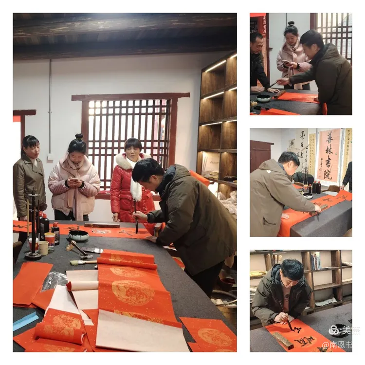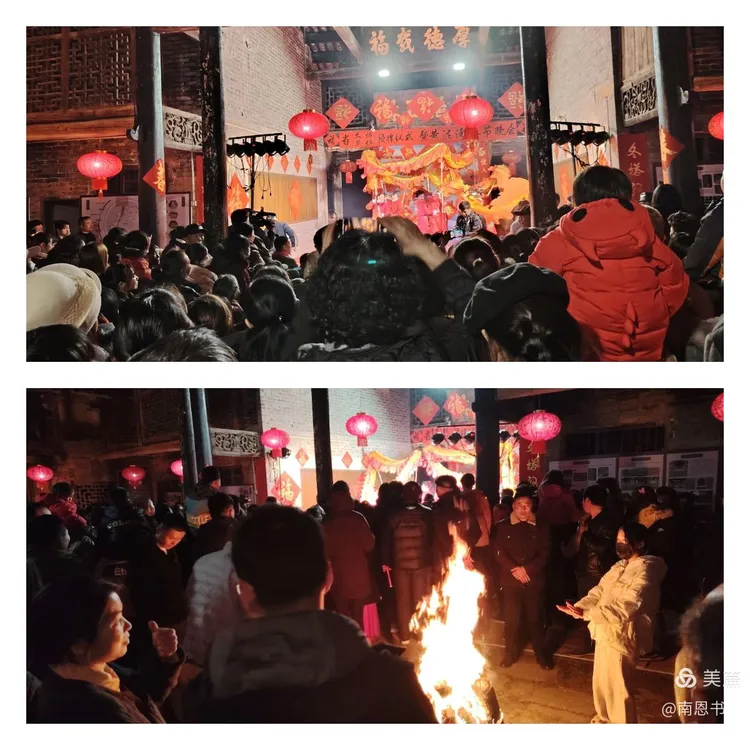 这是该村第二届“春晚”。古老的村落里,数天前就张灯结彩,写春联,送春联,大屋内各厅堂楹联对对,满目红妆,温馨和谐,春意盎然。当天从上午至下午,书法家们写春联,送春联,进入书写高潮,同时中堂屋走台彩排,锣鼓喧天,好一派春节景象。入夜,篝火熊熊,如冬日暖阳;玩龙舞狮,如春节闹元宵。一台迎新辞旧的嘉年华,一场主要由本村人导演、乡民们自演的晚会,预示着春天里“年年好过年年过,合家团圆闹新春”,来年人寿年丰,生活吉祥美好。