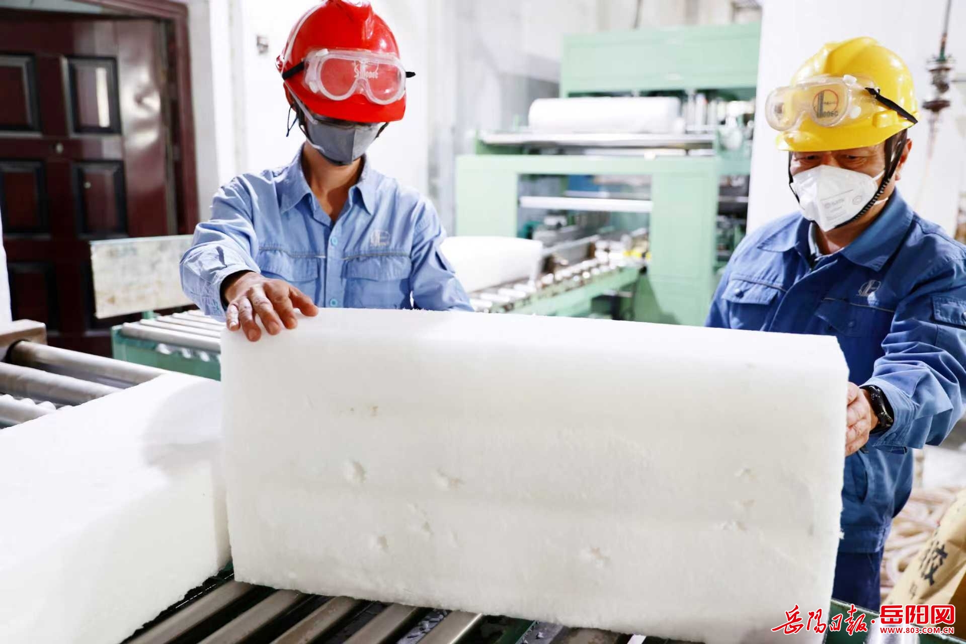岳阳日报11月10日讯(彭展)11月7日,湖南石化橡胶部SEBS片区SSBR(溶聚丁苯橡胶)装置包装线,当班员工检查新下线的块状SSBR成品外观质量情况。