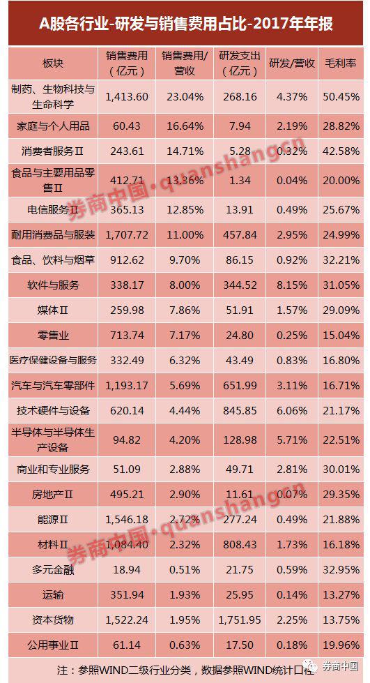 这意味着,2017年投入销售费用超过“制药、生物科技与生命科学”的,只有耐用消费品与服装、能源Ⅱ和资本货物这3个板块。