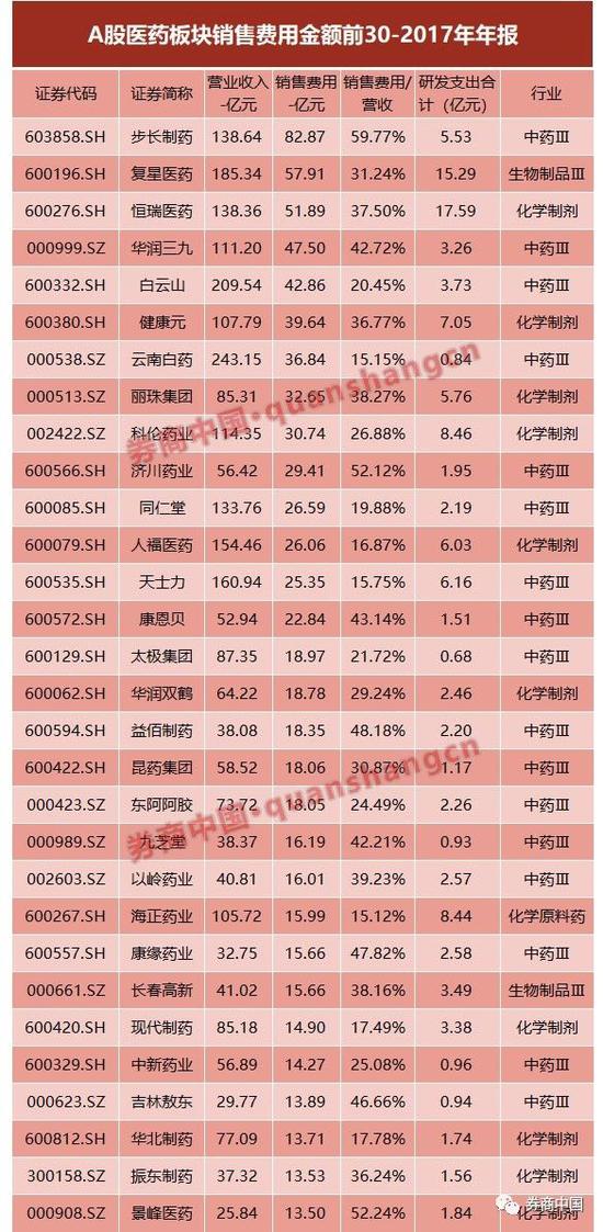 据券商中国记者统计,A股有170家生物医药企业的销售费用超1亿元,有74家对销售费用投入超5亿元,有37家投入超10亿元,有9家投入超30亿元,步长制药和、复星医药(36.820, -1.41, -3.69%)和恒瑞医药(69.010, -1.39, -1.97%)等3家企业投入超50亿元。