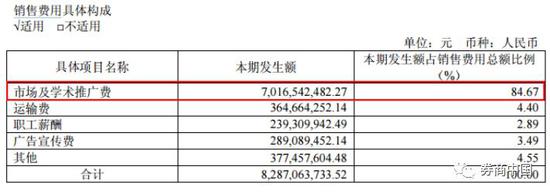 参照2017年年报,步长制药的销售费用有5个项目,其中“市场及学术推广费”占据大头,一年支出70.17亿元,占据全年销售费用的比例84.67%。