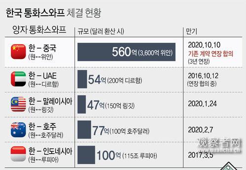 而据SBS的报道,韩日两国由于在独(竹)岛问题以及慰安妇少女像等问题上存在争执,因此货币互换协议也就没有了下文。美国则在2010年终止了和加拿大、英国、日本、瑞士、欧洲中央银行以外的所有货币互换协定,而且对于续签也缺乏兴趣。因此,和中国续签协议对韩国而言非常重要。