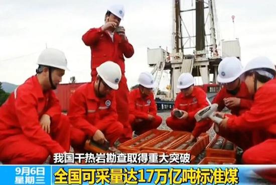 这是一种新兴地热能源,可广泛用于发电、供暖、强化石油开采等,在开发利用的过程中也几乎不产生污染物。“干热岩”在新能源中处于重要地位,是目前已知性价比最高的新能源。按照最保守估计,我国目前可利用的干热岩“地热能”,相当于17万亿吨标准煤!