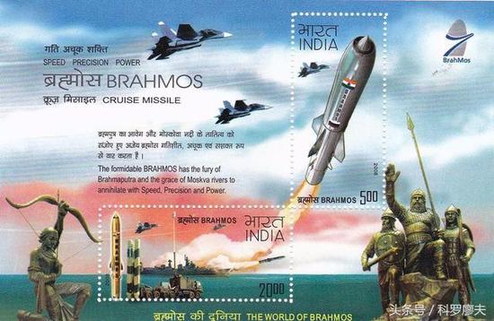 布拉莫斯导弹由俄罗斯和印度联合研制,设计代号为PJ-10。其命名是为了纪念两条著名的河流:印度的布拉马普特拉河和俄罗斯的莫斯科河,所以这导弹也可称为“布拉马普特拉莫斯科河”。导弹全长8.1米,弹径 670毫米,发射重量3吨,可携带重达300公斤的常规弹头。采用小型整体式冲压发动机,最大射程350公里,飞行马赫数2.8,最大弹道高度1.5万米,在飞行末段可下降为10~15米高度并且作蛇形机动以躲避敌方拦截,这显然是印度人的吹嘘,实际上布拉莫斯导弹引以自豪的2.8马赫超音速只能在1.5万米高空飞行,好几百公里外雷达就能抓住它。该导弹陆基型号于2001年首次发射成功,随后舰载型号也研制成功。