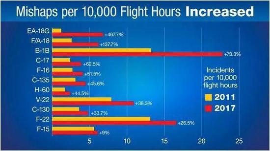 美军各机型的万飞行小时平均事故率增长情况,黄色为2011年事故率,红色为2017年事故率