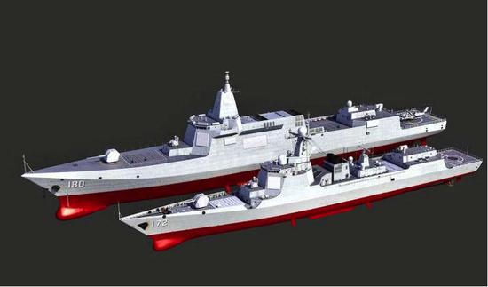 ▲早前网友制作的055与052D的CG图像对比图,可以看见其体型比052D来得大得多,当然图里055的舷号可以读者自行忽略,因为首舰的舷号是“101”(图片来源:网络)