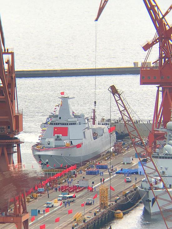 去年6月055首舰下水方式比较奇特,从当时的报道中大家看到的似乎首舰停在地面上,实际那个“地面”是大浮箱。浮箱注水后沉入水中,然后舰艇就可以被拖船拖入水中。而今年四五月份二号舰下水目前没有大图,评估判断应该和首舰下水方式一样。