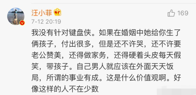 随后他还在评论区补充到自己不是刻意去怼网友,而是心疼小S给自己生了两个孩子,为了这个家付出了很多,哭一下不行,还不让老公赞美,难道身为男人就应该在外面吃饭应酬不顾家不心疼妻子就叫事业有成?汪小菲极力反对这样的价值观。