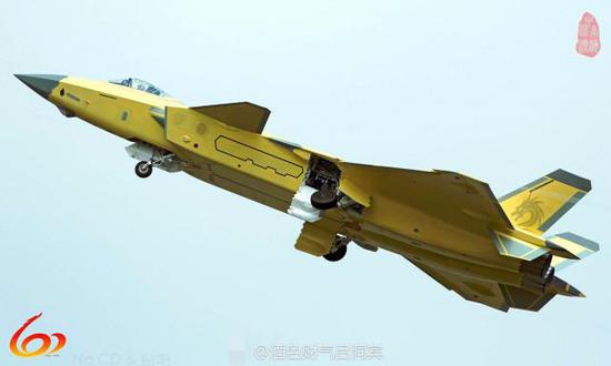 这架歼-20是最新出厂的黄皮机,机身表面尚未涂上灰色伪装涂装,裸露着黄色防护底漆和翼面前后缘的灰色吸波材料结构,凸显乐许多之前无法观察到的设计细节。从照片上可以看到,歼-20的前机身两侧和下方蒙皮表面有着数量繁多的嵌入式共形天线,不再像三代机那样大量使用突出于机身的刀形天线,这对于隐身飞机来说是基本功。此外,歼-20进气口、翼面前后缘等处还大量使用灰色的隐形复合材料结构,可能与歼-20总师杨伟在两会期间证实的歼-20战斗机已经应用民营企业研制的超材料相关。