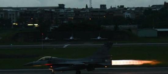 凌晨4时开始,天色仍暗,台空军花莲基地就有相关人员进行各项演练,4架幻影2000战机、10架F-16战机,紧急在加温坪待命。5时40分,6架F-16战机、2架幻影2000战机紧急升空。