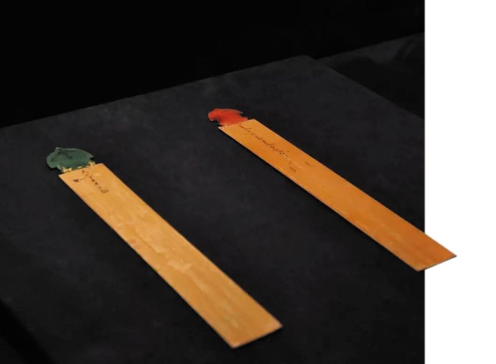 雍正帝每天除了要批阅大量的奏折,还要处理其他官方文书,接见、评价、任命官员……层层官僚机构事无巨细都要皇帝来裁夺。清代王公或官员想觐见皇帝,首先要呈递写有官员姓名、官衔的竹签。此次展览的专题展柜中有一对不起眼的竹签,长不足一尺,竹签头分别漆成红色和绿色,下部漆黄色,竹签上写有人名。这两件文物叫红、绿头签,又叫“膳牌”。皇帝早膳后会根据呈递的膳牌,选择需要召见的官员,开始处理一天的政务。