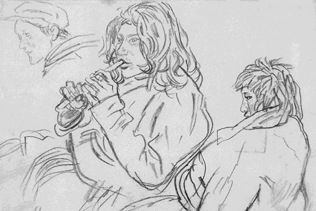 “它就是一个小混蛋站在海边,脸的五官都没有,身体、裤腿、鞋都歪歪扭扭的,显得很生手。可是我每次看到这张毫无意思的画,就会想:‘他妈的,这才是真正的绘画,这才是真正的艺术。’我会忘记我所喜欢的许多非常了不起的巧手,我会无可奈何。”