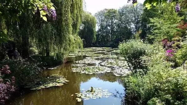 莫奈故居和花园位于法国诺曼底的勒阿弗尔吉维尼村东部,处在巴黎正西方向70公里的上诺曼底省在塞纳河谷的一个小山坡上,周围是葱郁的树林和碧绿的草场,那里有莫奈后半生的住所和工作室。花园巧妙地将附近埃普特河的河水引入园中,形成了一个小池塘。莫奈生前在池塘中种满了睡莲,并安放了一座著名的日本桥(经常出现在他的画中),这绚丽而富于异国情调的情景伴随着光影的无穷变换激发了莫奈的艺术灵感。如今,经过保护与重建,莫奈的花园内繁花似锦,并且“四时之景不同”。