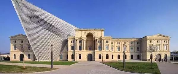 德国德累斯顿军事历史博物馆位于德国德累斯顿,建立于1897年,2011年由建筑师丹尼尔·里伯斯金设计改建,丹尼尔使用了极其尖锐纯粹的锐角形体插入老的博物馆建筑里,新的超级锐角形体由钢架结构,混凝土,钢格栅和玻璃组成,内部容纳一个新的观景台和展览空间,沉重的传统建筑与尖锐的新形体的对比所产生的紧张关系和颠覆感,不可避免滴被赋予历史与文化的符号象征。而三角形指向了德累斯顿遭受的轰炸来自的方向。新的空间垂直展开,充满了戏剧性,不断地质疑这个城市,让人们不断地反思。