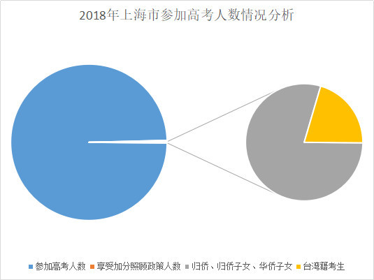 上海市2018年参加高考5万人,享受加分照顾政策认为仅有136人,其中归侨、华侨子女、归侨子女和台湾省籍考生共136人,烈士子女0人,退役士兵或军人0人,边疆、山区、牧区、少数民族聚居地区少数民族考生0人。