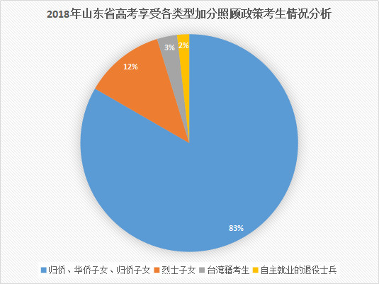 山东省2018年参加高考人数为59.2万人,享受加分照顾政策的人数仅有145人,其中归侨、华侨子女、归侨子女和台湾省籍考生有58名,烈士子女8名,退役士兵或军人79名。