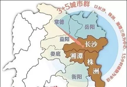 “3+5”城市群战略以长沙、株洲、湘潭三市为中心,1.5小时通勤为半径,包括岳阳、常德、益阳、娄底、衡阳5个省辖市在内的城市聚集区。在原“交通同环、电力同网、金融同城、信息同享、环境同治”的基础上形成“新五同”:交通同网、能源同体、信息同享、生态同建、环境同治。