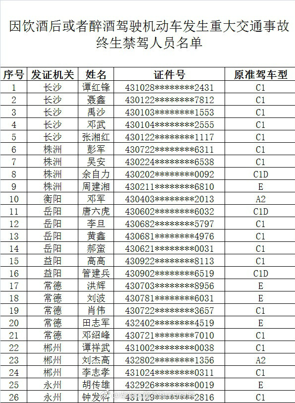 6月26日,省公安厅交警总队召开湖南省预防重特大道路交通事故专项整治暨“落实责任,携手平安”道路交通安全宣传月新闻发布会。会上公布了一批终生禁驾名单,有没有你认识的?