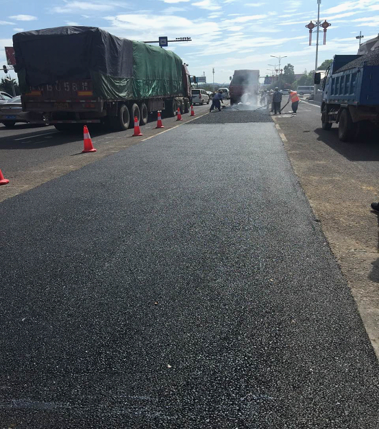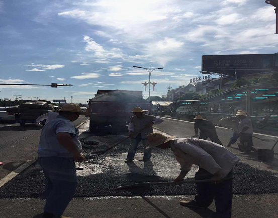青砼摊铺,已摊铺沥青砼600m2。现场维护施工人员克服温度高、交通压力大的困难,快速、高效展开路面施工。该项目分三段对岳阳大道部分主干道进行维修改造,其中居然之家红绿灯处维修改造75m,居然之家正对面路段维修改造28m,