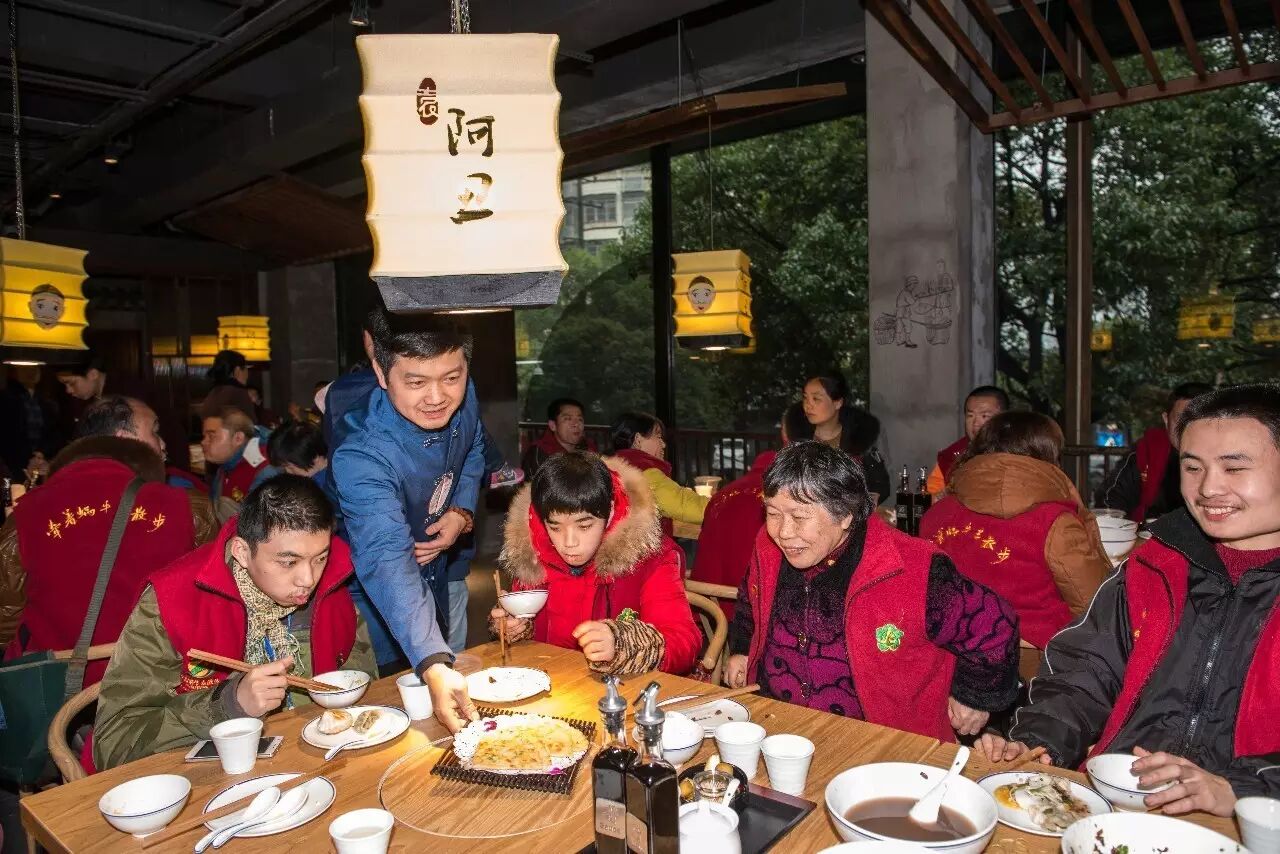 11时许,智力残疾人王长及其父亲兴致勃勃地来到阿丑餐饮店,受到了员工的热情欢迎。刘静、宋琦、胡天星等6位残疾卖报人一起来到了阿丑餐饮店。与此同时,岳阳楼区残疾人日间照料中心的兰卫江等4位老师带着郑栋、刘旭等12个学员,岳阳市洞氮医院脑瘫儿童康复中心主任王奇带着22位脑瘫孩子和其亲属及老师共60余人先后赶到该店。