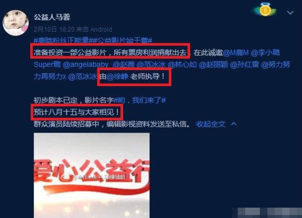 除了拟邀请徐峥作为电影“导演”之外,鹿晗、赵薇、范冰冰、孙红雷等大牌明也在马蓉艾特名单之中。看样子是想要在半个娱乐圈里引起“公益”潮流,但目前为止,并没与任何被邀请明星出面回应此事,究竟是马蓉一厢情愿,还是谋划已久,相信不久就会真相大白!