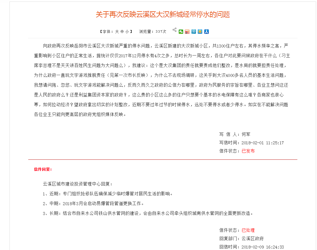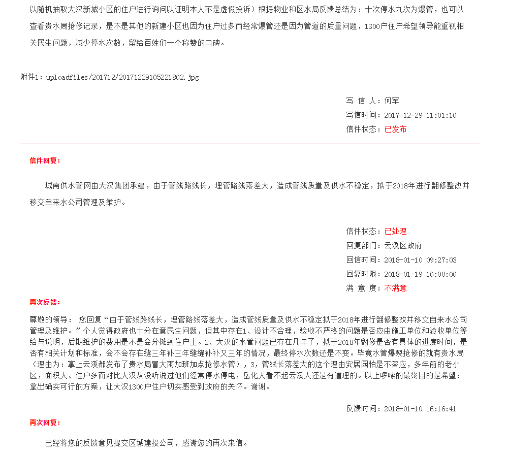 尊敬的领导: 我是云溪大汉新城住户,大汉新城最近一年半来停水爆管次数奇多,详见图片,根据云溪区办公室回复:停水爆管的主要问题是:设计问题、施工问题、和天气问题,归根还是质量问题(安居几十年的小区没见停过水爆过管子),那么问题来了,为什么这个本来归城投和大汉集团的维修费用为什么要发文给物业(最后还是羊毛出在羊身上,均摊到我们业主这)要物业缴维修费用?董事会的决定是否符合法律?凭什么要我们业主最后均摊?六千大汉住户居民向领导求助此问题。谢谢,提前祝端午安康。 |