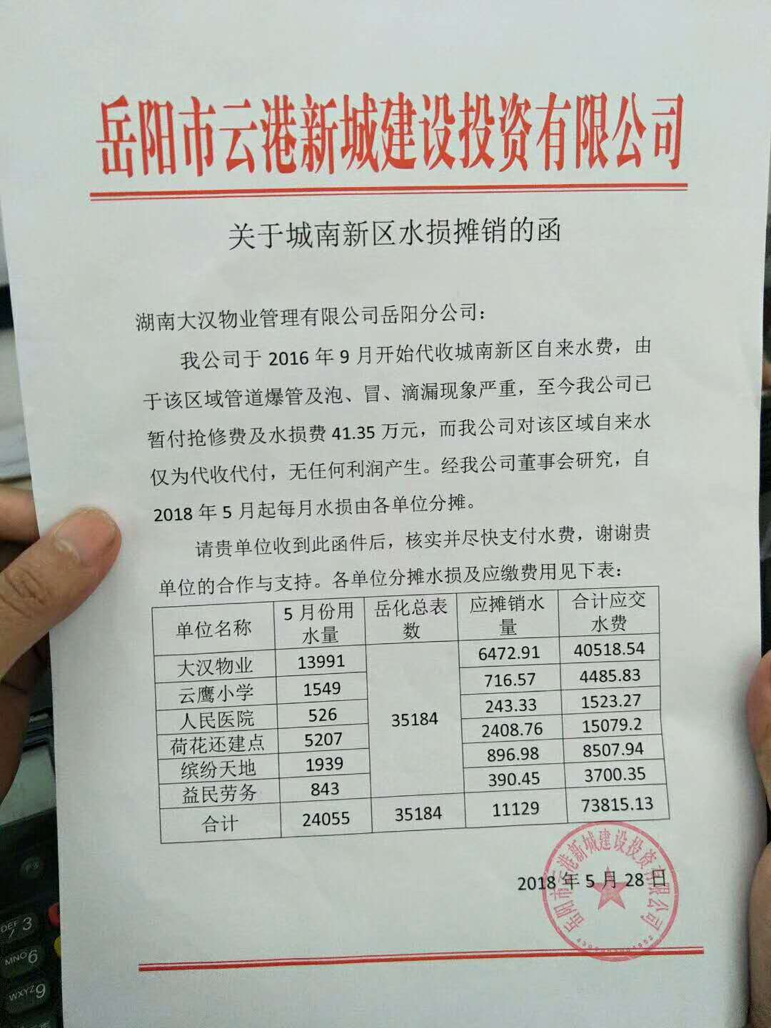 云溪城南片区水网由云港新城交由大汉城建建设,水源由岳化水厂接到城南,管道建成后因历史原因区自来水公司没有接管,一直由云港新城公司代收水费(1.98元/吨)代付到岳化水厂(1.98元/吨)。云港新城公司没有收取任何手续费,也没有利润,而每个月的水损一直由云港新城公司承担(2016年9月以来亏损40余万元)。云港新城公司是地方国有企业,每补贴一分钱都要向母公司借钱,不堪重负。所以,从今年五月份起,每月的水损,云港公司决议由各用水单位分摊。 |