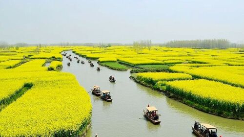 登上游船,泛舟水上,做一次画中人。小船顺流而下,穿梭于繁花如金的小岛之间,船在水上行,人在花中游。两岸的油菜花岛一个个迎面而来,又缓缓离去,水面荡起涟漪,清风迎面送爽,船桨拨开水面,船娘一身蓝白花土布衣衫,笑脸如花儿绽放……坐在乌篷船头,恍若在周庄,在同里,在油菜花清香味氤氲着的江南水乡梦里。