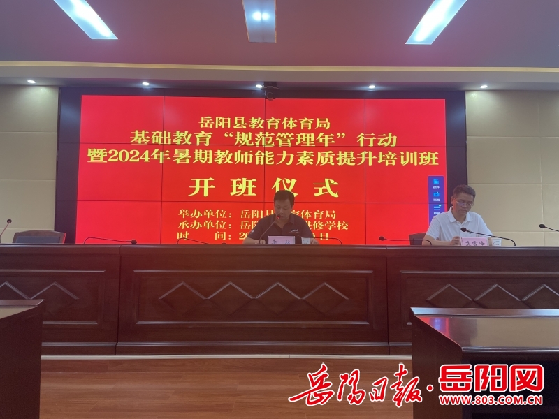 岳阳日报全媒体讯(通讯员 万石正 李振远)8月29日,岳阳县教育体育局举办基础教育“规范管理年”行动暨2024年暑期教师能力素质提升培训班,深入学习贯彻习近平总书记重要讲话和指示精神,认真落实教育部和省市县部署要求,聚焦规范整治基础教育系统存在的“安全底线失守”“日常管理失序”“师德师风失范”等问题,开展集中研修培训,整体提升办学治校和教书育人能力,营造风清气正的良好教育生态,切实提升人民群众对基础教育的满意度、获得感。县教育体育局党委书记、局长李林出席开班仪式并作动员讲话。