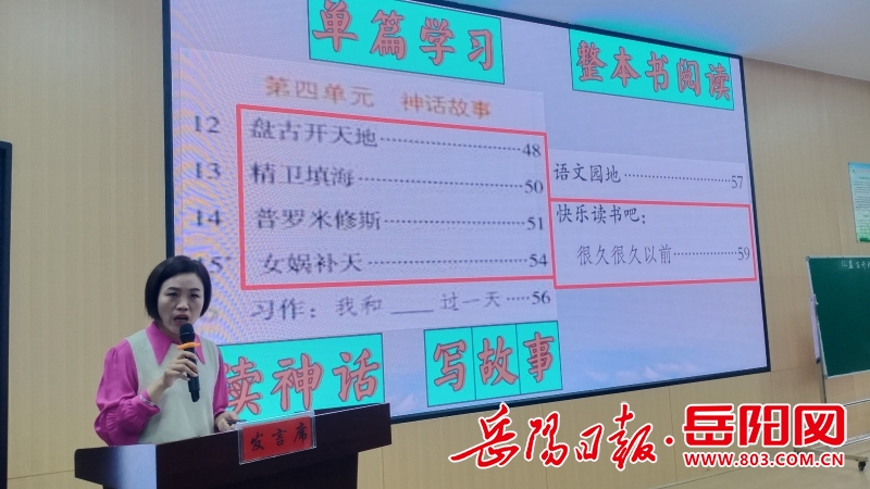 活动开始,三阳明德学校李登峰校长发表了热情洋溢的致辞,她期待活动能为各位老师架起语文教研的桥梁,让阅读教学教育研究走得更宽更快。平江县小学语文名师工作室首席导师曾君丽老师作《由单篇走向整本书阅读教学——“神话故事”单元整体设计解读》微讲座。她从语文课程标准相关学习内容和目标定位出发,就“神话故事”单元整体设计进行了详尽解读。曾君丽老师重点强调:一是读单元课文,寻神奇之处;二是阅读整本书,探索创作密码;三是通过阅读实践活动,让学生课内学法,课外综合运用多种方法阅读整本书,多方位呈现整本书阅读的学习成果,从而建构整本书阅读经验,提高整体认知能力,逐步形成独立阅读能力,丰富精神世界。