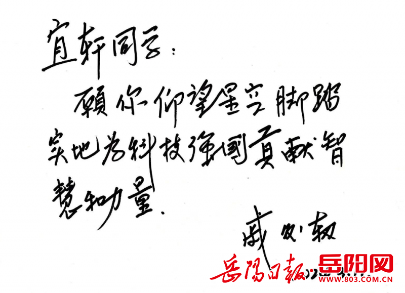 而支撑他一路前行的,是中国工程院院士、“神舟”飞船首任总设计师戚发轫亲笔送给他的一句寄语:“宜轩同学,要仰望星空,脚踏实地,为实现科技强国贡献自己的智慧和力量。”
