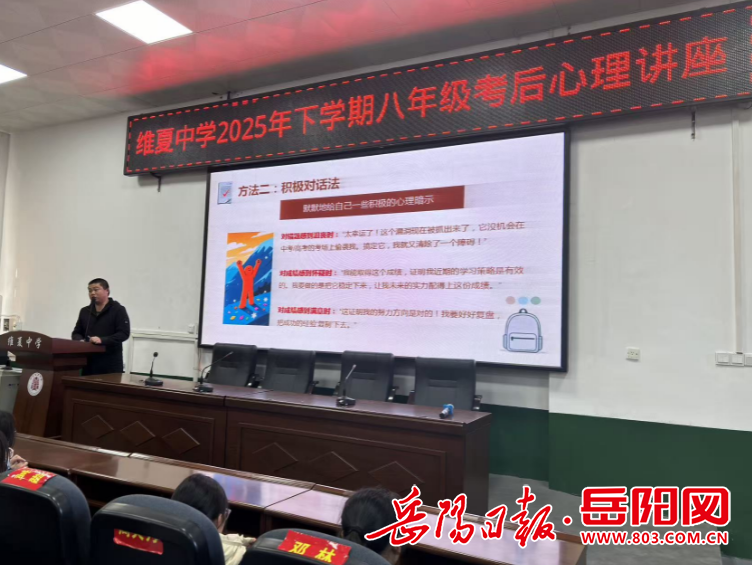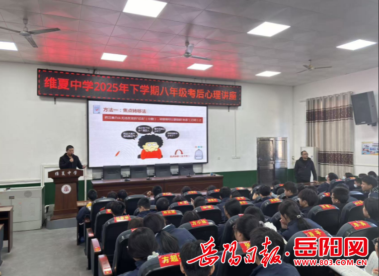 岳阳日报11月20日讯(通讯员 邓林 何宇琪)考试落幕,成长启航。11月19日,平江县长寿镇维夏中学一场以“掌握复盘思维,开启进阶之路”为主题的心理讲座,为八年级学生提供了一套将考试“失落”转化为深层“收获”的行动方案。