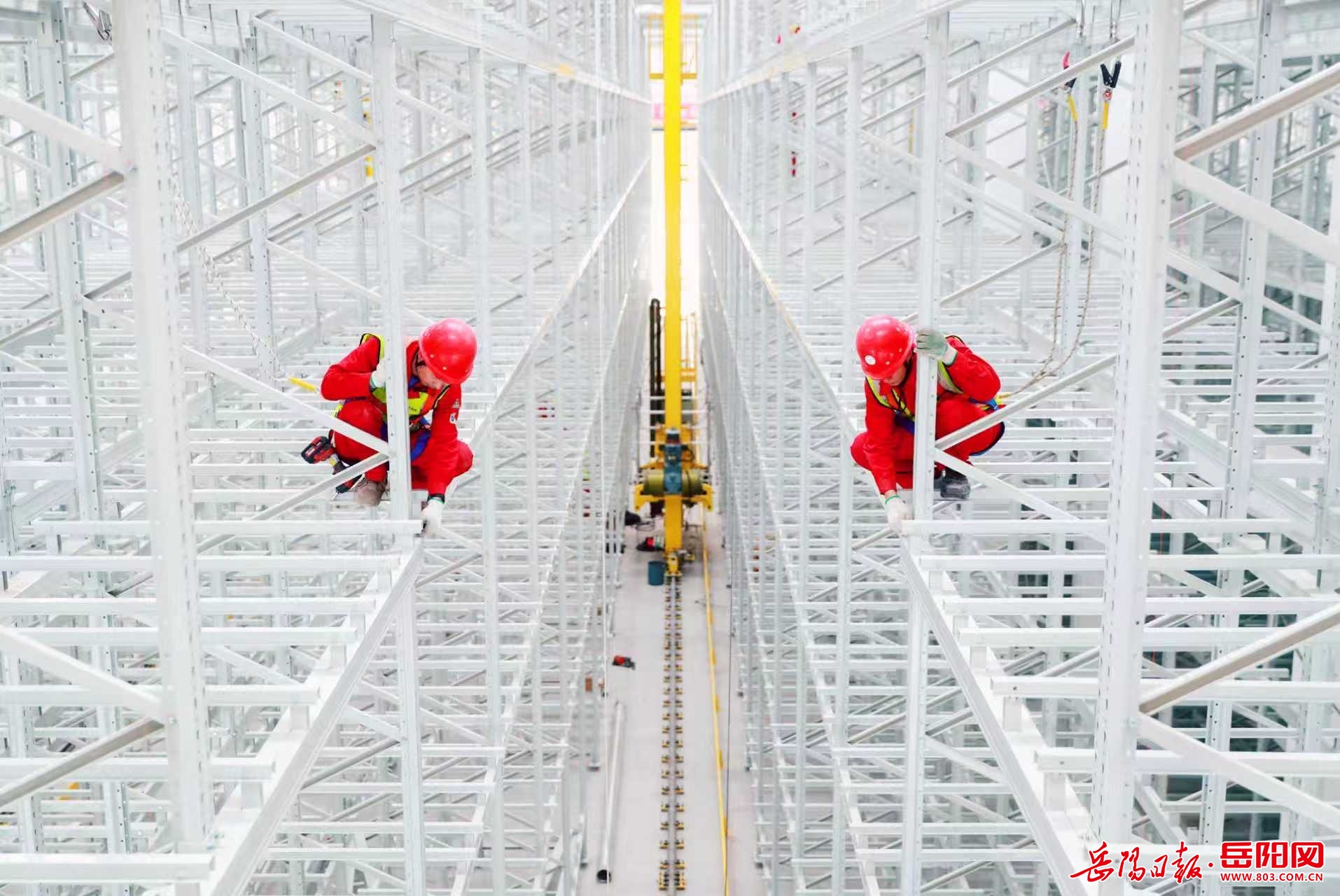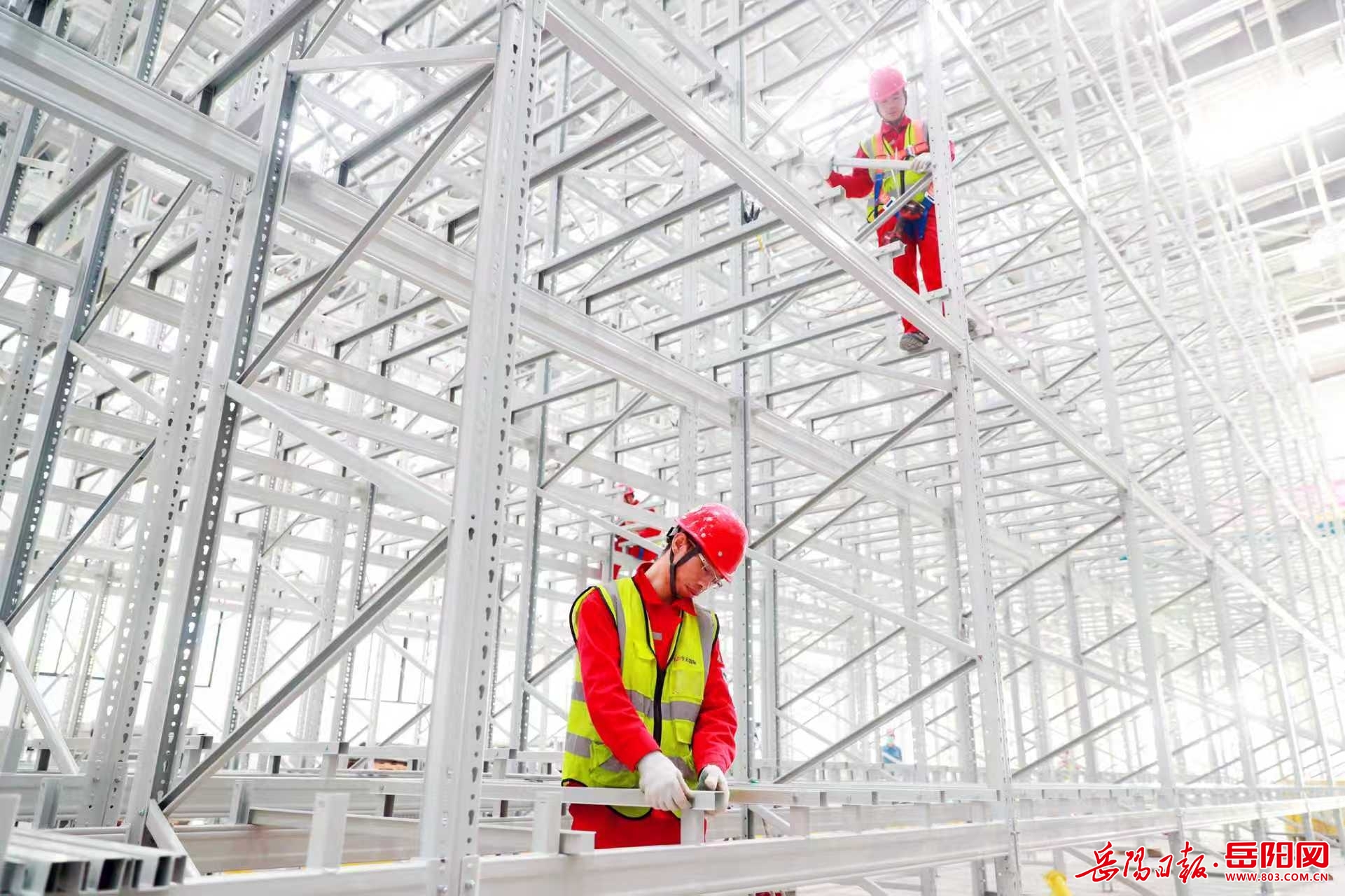 图为12月9日,湖南石化橡胶部SIS片区立体仓库建设现场,承包商中石化南京工程公司施工人员在安装货架。