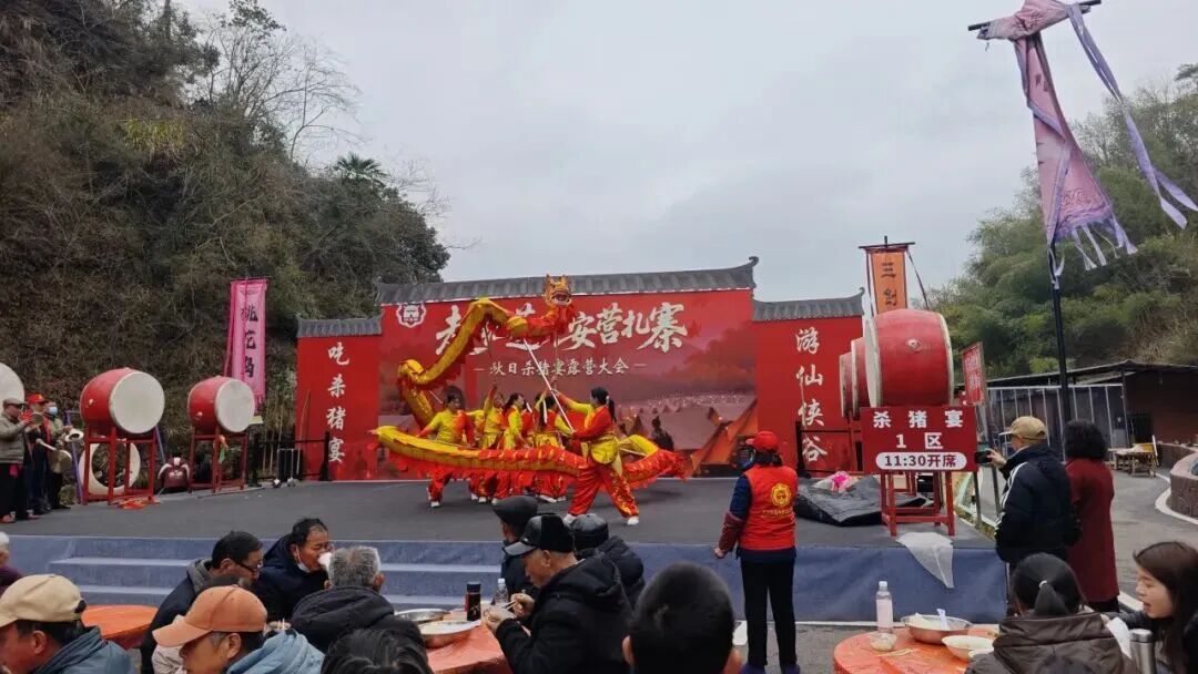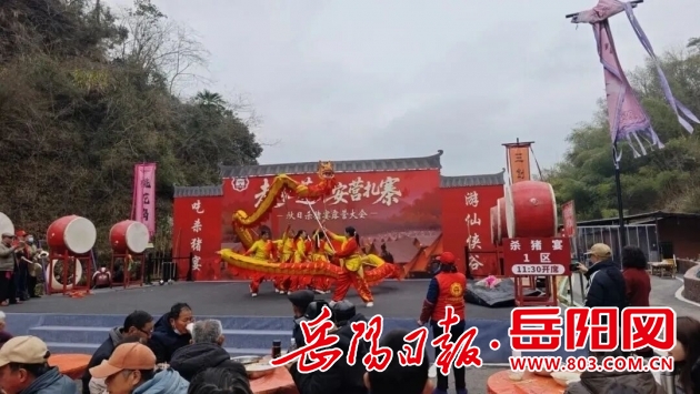 来到位于平江安定镇的红莲兵寨景区,你可以体验最正宗的平江杀猪宴。杀年猪,一直是平江农村过年的一项颇具地方色彩的民俗活动。伴着喜庆的锣鼓,“千人杀猪宴”热闹开席。一盆盆热气腾腾的“杀猪汤”端了上来,先舀一大勺汤吹吹热气喝下去,滚烫鲜香直冲喉咙。席间还穿插了舞龙祈福、武术展演等民俗活动,让游客在烟火气中感受传统年节的魅力。