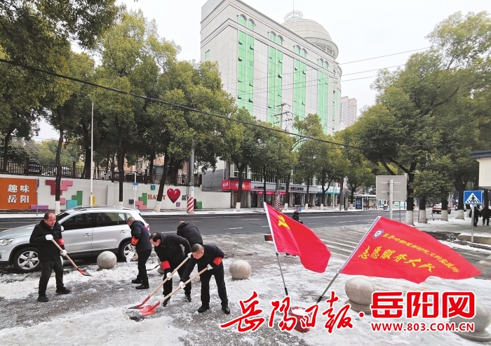 连日来,我市面临大范围、持续性雨雪冰冻天气,广大党员干部积极投身扫雪除冰行动。图为1月21日,岳阳楼区东茅岭街道组织全体干部职工和志愿者在辖区开展除冰铲雪行动,确保道路畅通和居民群众出行安全。