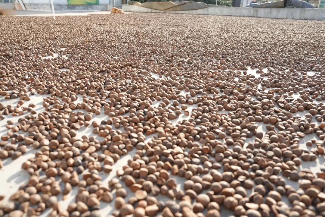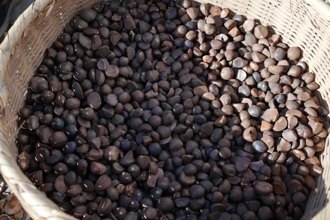 “油茶籽摘回来,先离地堆沤三到五天继续熟透,防止杂质混入污染油茶籽,手工挑去杂质,接着入炉烘干、二次分拣,确保一粒坏籽、碎壳及杂质都不进榨油机。”闾松柏指着刚分拣好的油茶籽说道。