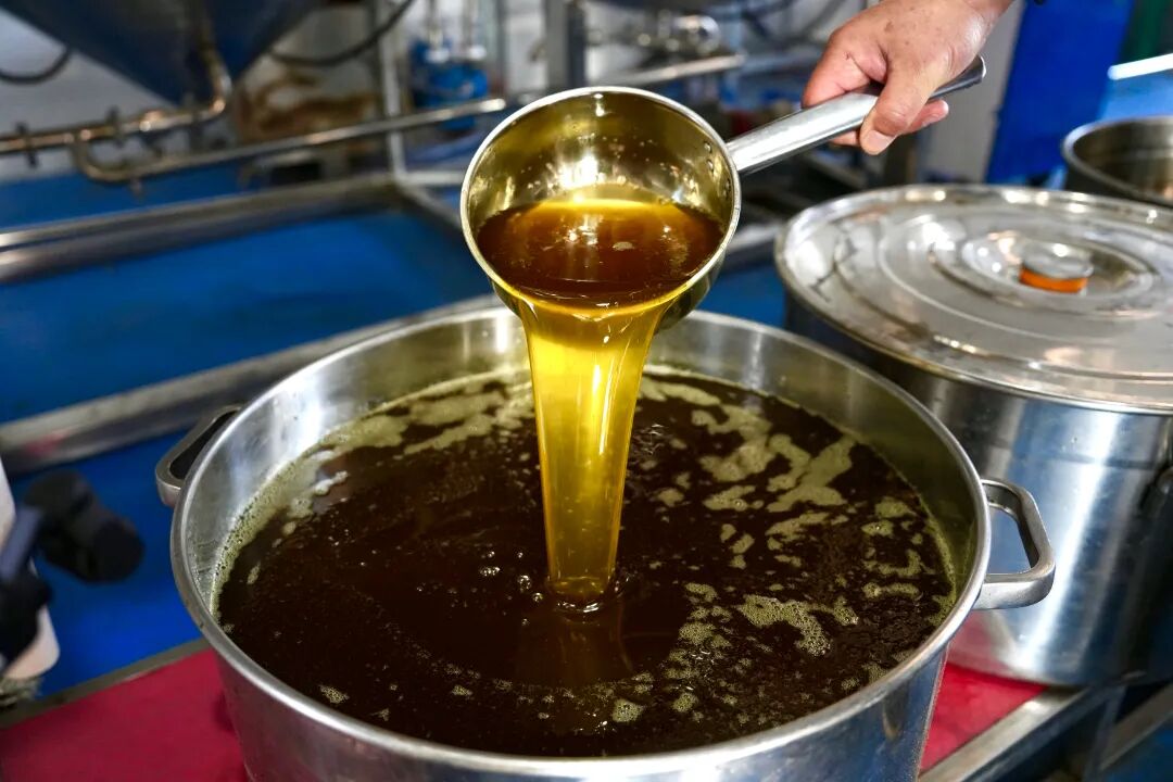 合作社另一侧,油茶基地负责人闾松柏正盯着压榨环节的每一个细节。碾碎的油茶籽倒入蒸桶,蒸腾的热气裹着淡淡的果香弥漫开来,蒸熟拌匀后填入铁环压成紧实的茶饼,再逐一送进榨油机。随着机器缓缓加压,金黄透亮的茶油顺着槽道缓缓流淌,浓郁醇厚的香气瞬间浸透了整个作坊。