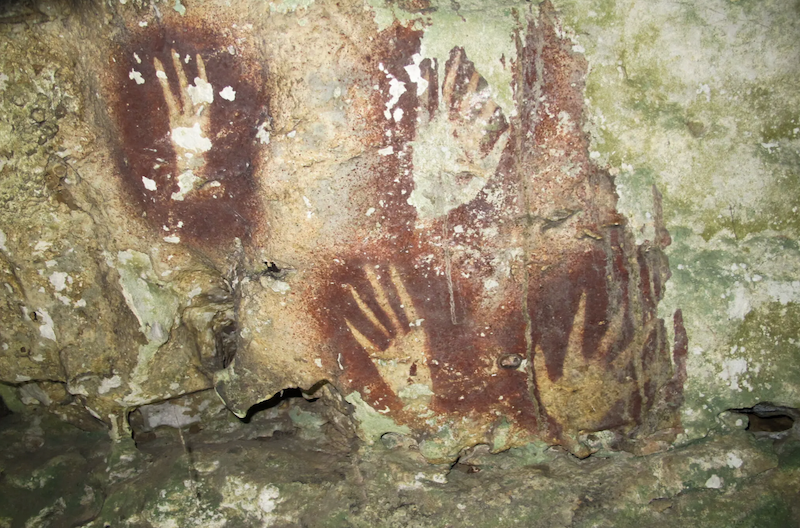 这处绘有一系列史前岩画的洞穴位于苏拉威西省的穆纳岛。一支由印尼和澳大利亚考古学家组成的国际团队对洞穴内岩壁上一处手印图样岩画进行了年代测定。