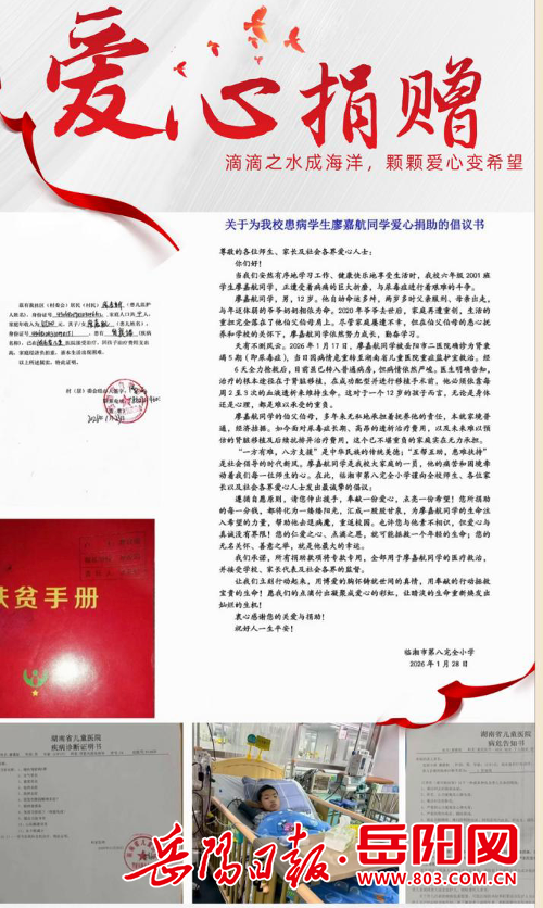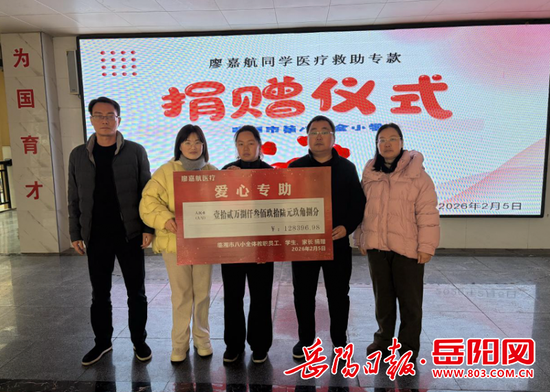 岳阳日报2月6日讯(通讯员 张俐)近日,临湘市第八完全小学全体师生及家长为该校六年级2001班学生廖嘉航发起爱心募捐,共筹得善款128396.98元,助力其抗击病魔。
