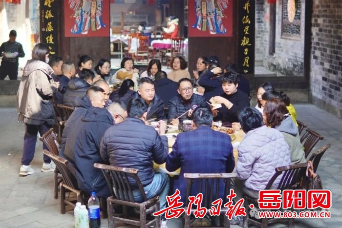 热闹的不止豆腐作坊。王家塅里,20多名游客围坐一桌,享用地道的张谷英团年饭,提前拥抱新年喜悦。油豆腐烧肉、杀猪菜……一道道特色家常菜让众人赞不绝口。