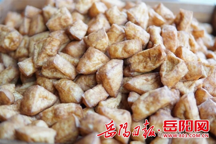 刚成型的豆腐白嫩嫩、水灵灵,手起刀落间,便被切成匀称的三角块。一谈及油豆腐的来历,张师傅便打开了话匣子:“以前做的白豆腐不耐存放,老一辈人试着把它油炸,发现不仅保质期变长了,口感也和白豆腐截然不同,更有嚼劲、更入味。就这么一代代传下来,油豆腐便在张谷英手里慢慢兴了起来。”