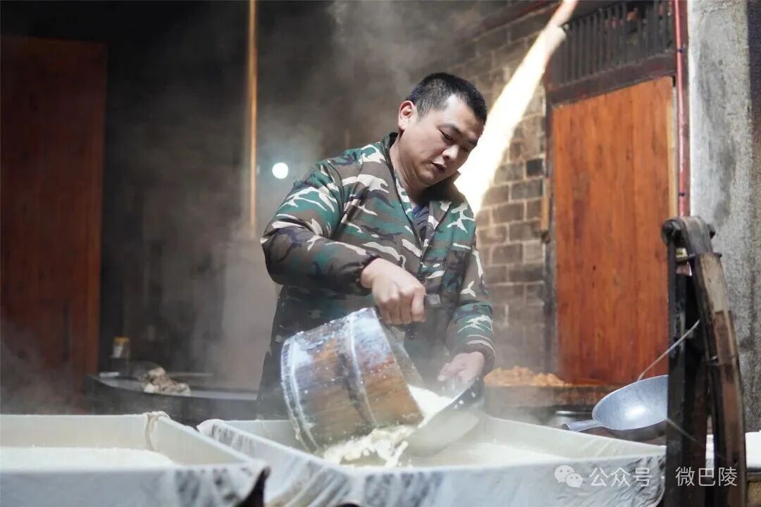 冬日阳光斜穿过天井,在青石板上落下斑驳的光影,伴着水滴声,宁静安然。院落一角的柴火灶里,火苗噼啪作响,张师傅正有条不紊地俯身忙碌。泡豆、磨浆、煮浆、点卤、压型……每一步都是老辈传下的讲究,屋子里弥漫着浓郁的豆香。张谷英豆腐色、香、味俱全的秘诀便藏在渭溪的水中。