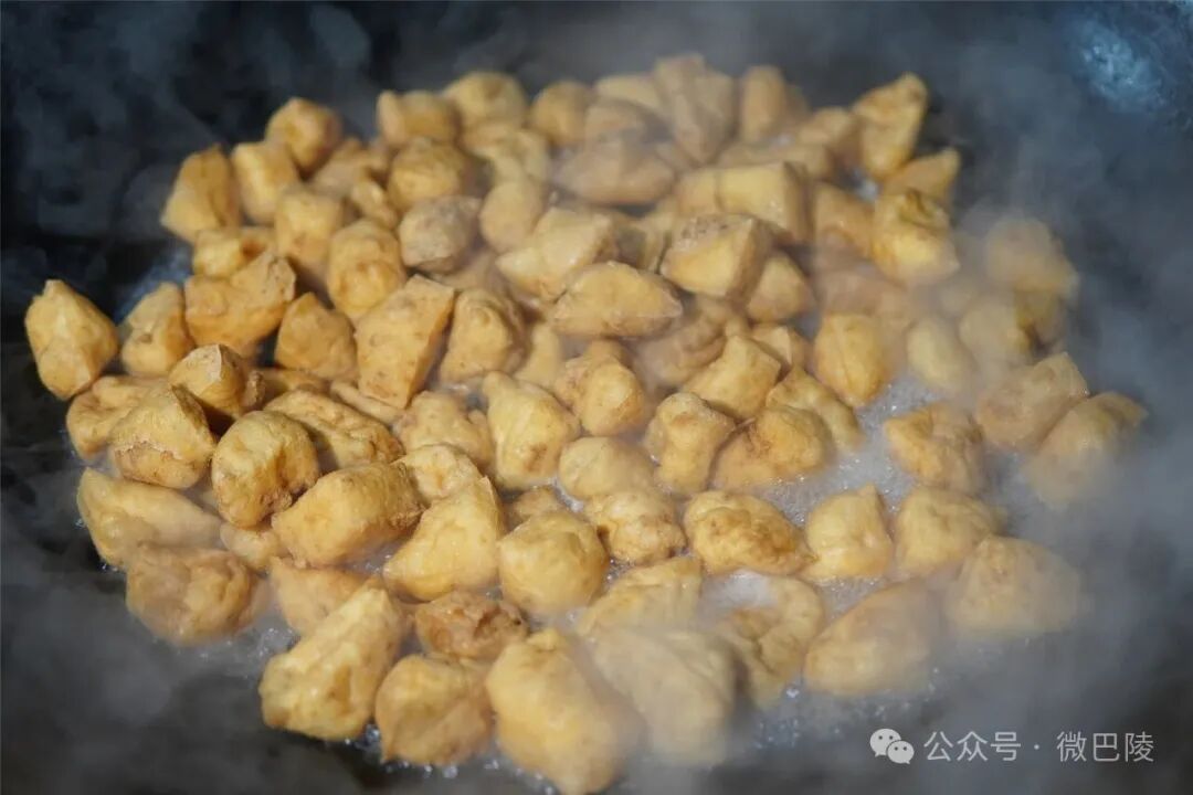 话语间,油温渐热。切好的豆腐块滑入其中,一场奇妙的蜕变悄然上演。随着油温传递,原本温润洁白的豆腐慢慢膨胀,像是注入了幸福的魔力,变得圆鼓鼓、胖嘟嘟,色泽也转为诱人的金黄,在油锅里欢快地翻滚。袅袅炊烟裹着豆香飘出屋外,与古村的红灯笼、青石板相映成趣,构成腊月里最鲜活的画面。