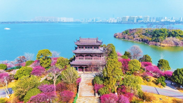 2月8日,春节将至,南湖新区㴩湖阁仿佛坐落于一片粉白色的云霞之中,四周梅花蓬勃盛开,如锦似绣。阁前,南湖碧水宛如明镜,将这一幅“梅花映阁碧水环绕”的冬日春景图完整收纳。暗香浮动间,已透出浓浓的早春气息。