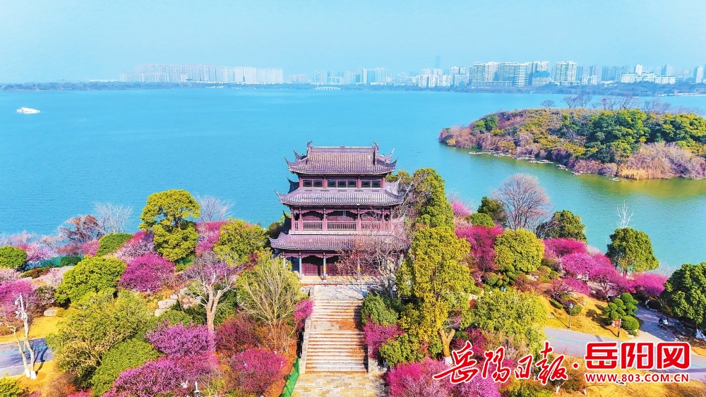 2月8日,春节将至,南湖新区㴩湖阁仿佛坐落于一片粉白色的云霞之中,四周梅花蓬勃盛开,如锦似绣。阁前,南湖碧水宛如明镜,将这一幅“梅花映阁碧水环绕”的冬日春景图完整收纳。暗香浮动间,已透出浓浓的早春气息。岳阳日报全媒体记者 彭正阳 摄