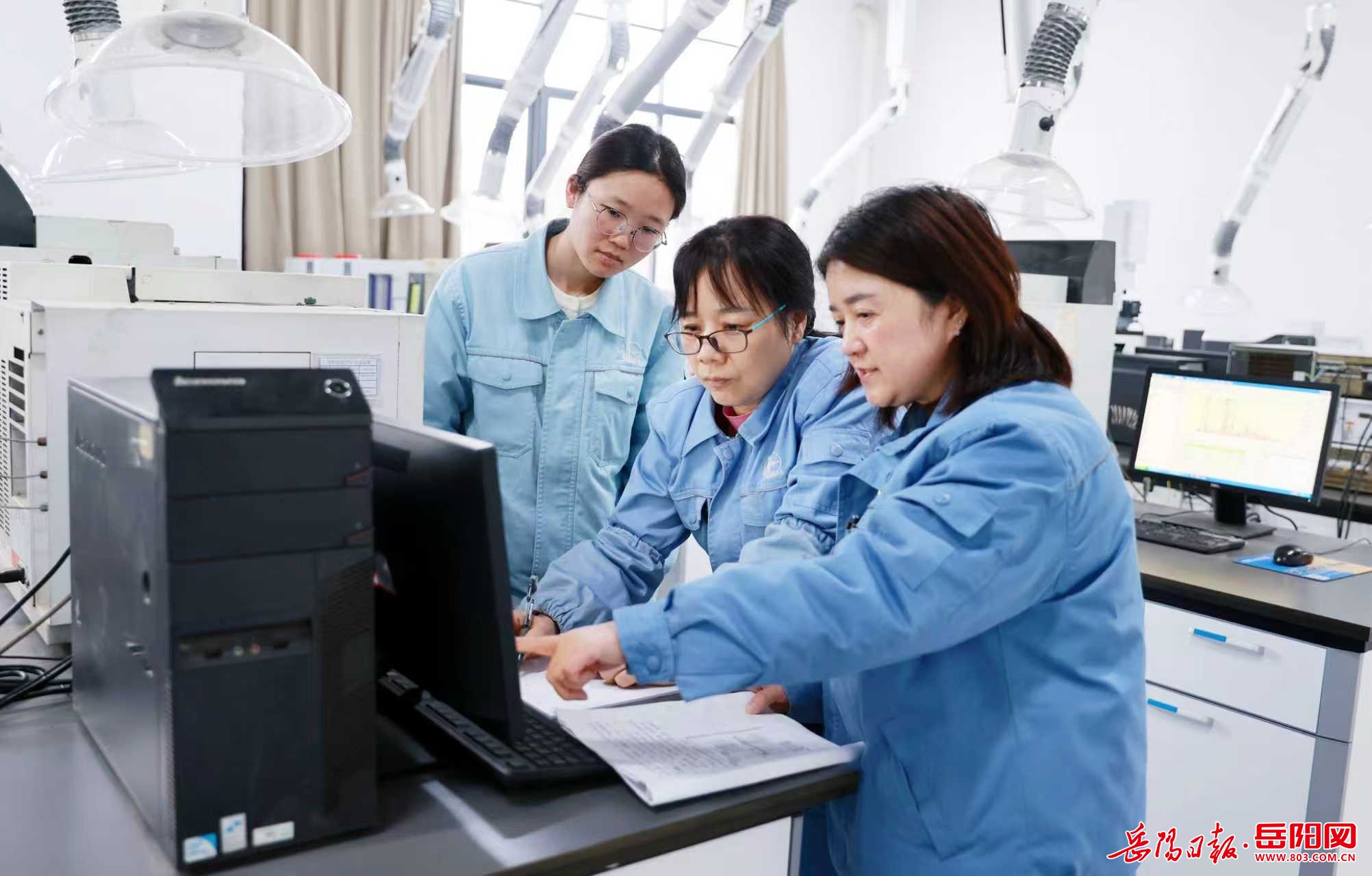图为2月9日,湖南石化分析检验中心分析室(二区)色谱分析室,当班员工黄瑾(中)和技术员郭明(右),指导青工谭瑾对树脂部T103釜氯丙烯样品进行色谱分析,就工作站的使用、色谱峰的识别、分析数据的处理等关键操作进行讲解,通过悉心“传帮带”助力青工熟练掌握岗位理论和实操知识,为年产16万吨高性能环氧树脂新项目开车分析夯实基础。